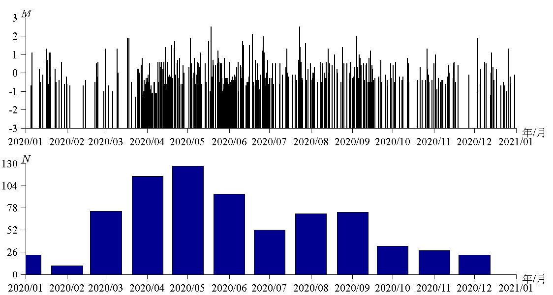 图2 2020年陕西省地震M-T图和月频次图