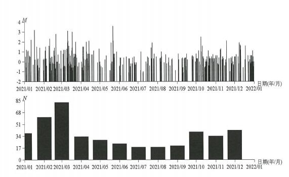 图2 2021年陕西省地震M-T图和月频次图
